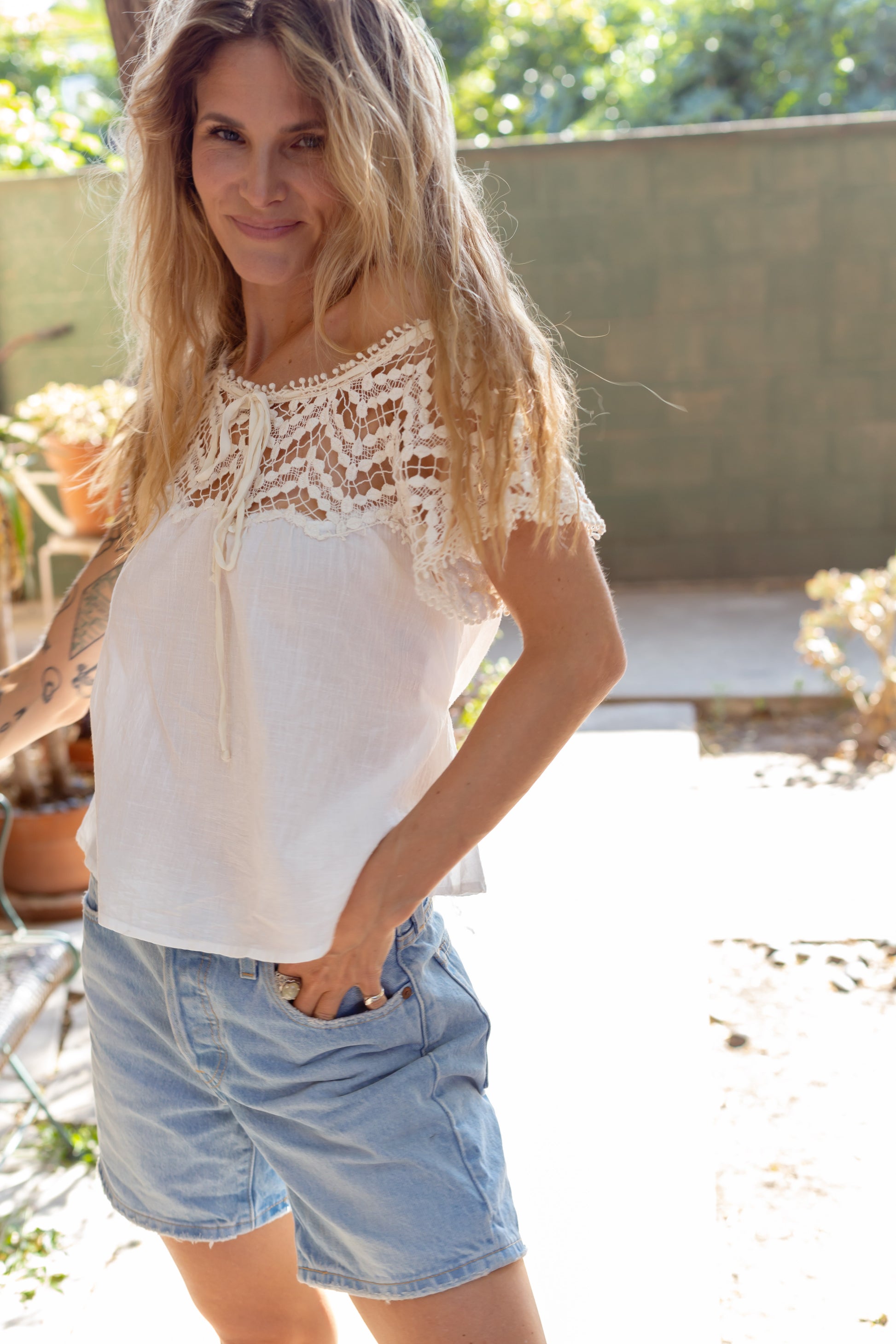 Inspired from a Vintage piece, the Florabelle Blouse is the perfect Boxy fit top with side slits for ease and back trim tie to create shape or more fitted look! Composed from 100% Cotton with a hand crafted crochet neckline. Designed to be worn off the shoulder with front tie or can be adjusted to cover shoulders as a multi wear look.
