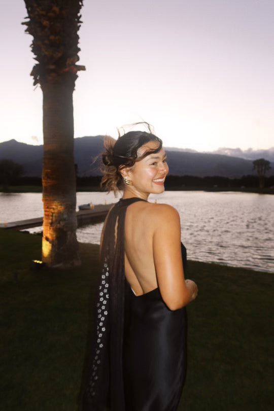 Luxurious Silk Halter Midi with Low plunge back and Oversized Lace neck Tie. Fully Lined with Silk Crepe de Chine. Cut on the bias so it drapes beautifully over the hips and waist without clinging. Perfect for Brides or evening events.