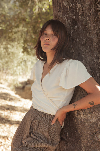 Crafted from a soft linen-modal blend, it features a flattering wrap design with delicate ribbon lace trim and flutter sleeves. Lightweight and breathable, this top is perfect for warm days, offering a feminine and flowy silhouette.