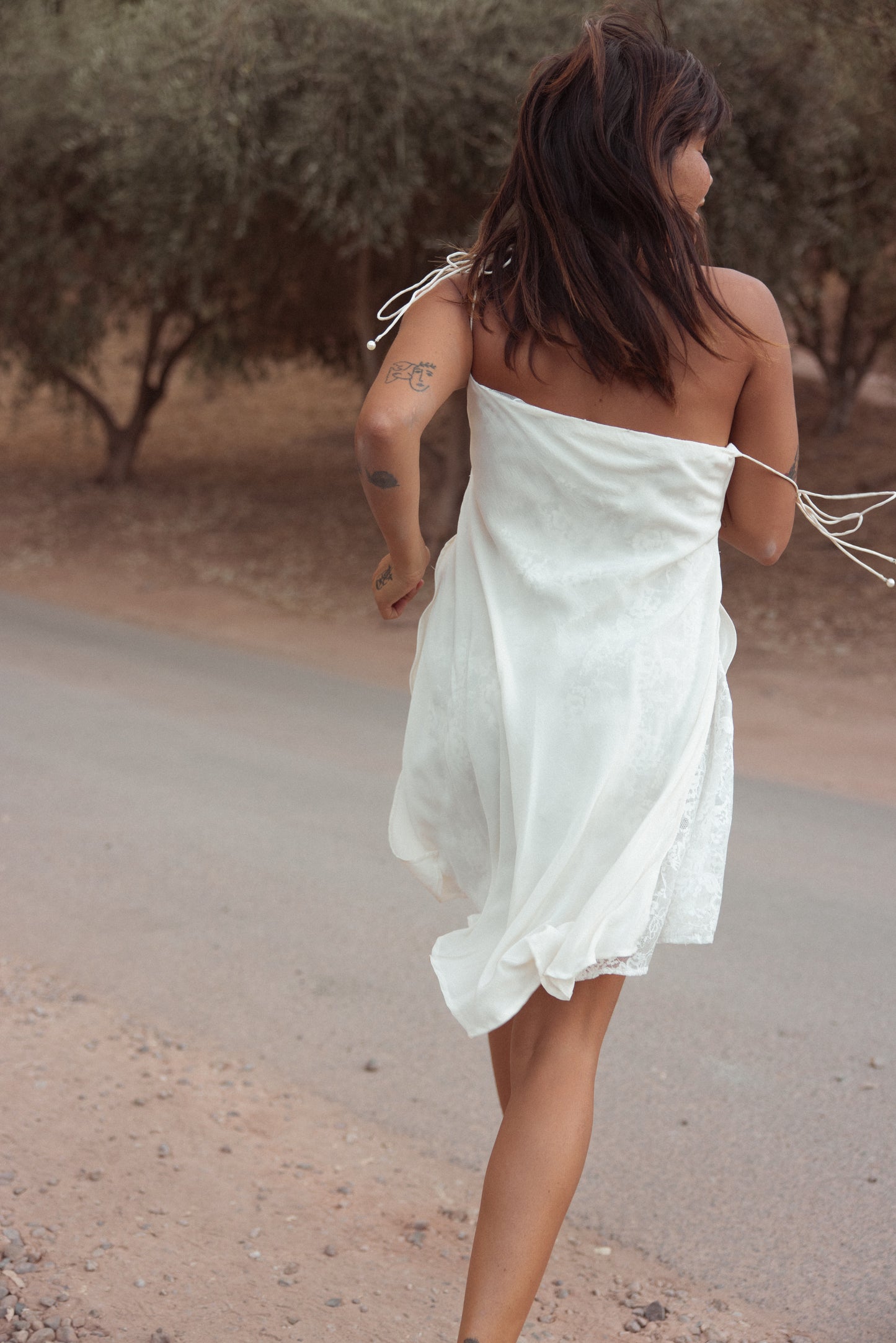 The Dress that started it all! Swoon Reversible Silk Draped Dress offers two looks in one, with a luxurious silk drape and delicate lace underlay. Soft and flowy, this dress creates an elegant, flattering silhouette that can be silk or lace side up for versatile styling. Adjustable shoulder ties with drop pearl details and a draped cowl back. Perfect for evening events or special occasions, it combines timeless elegance with modern versatility.